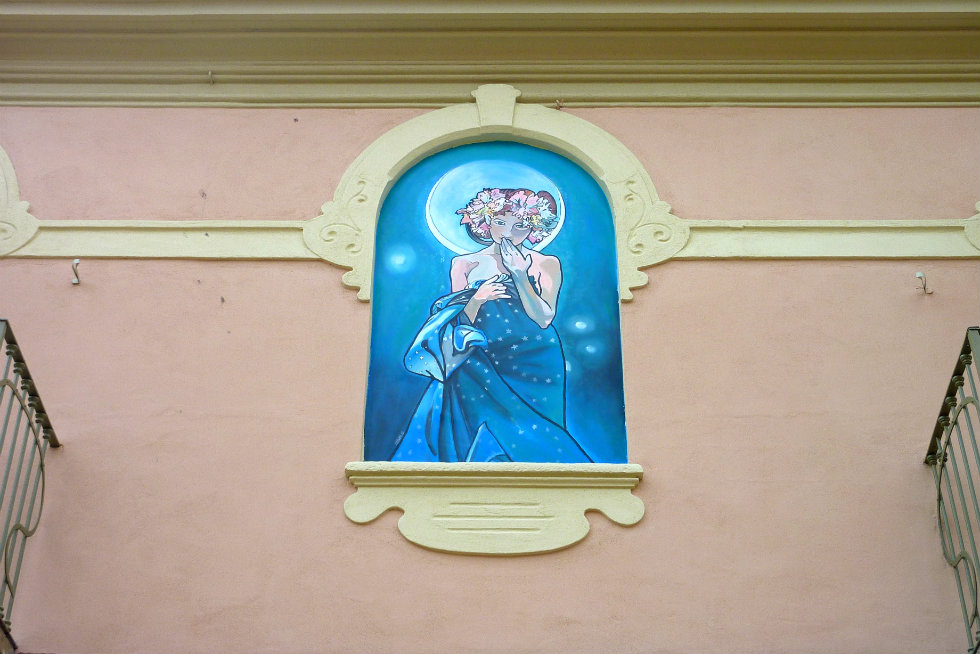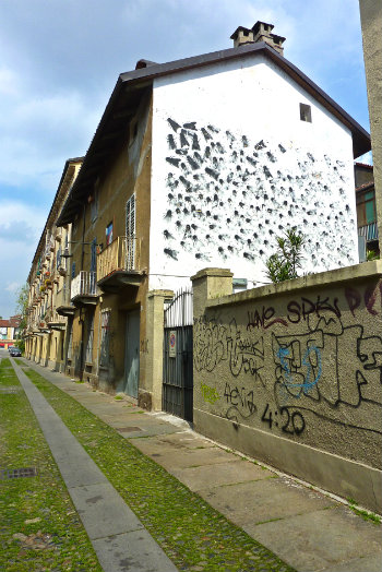 To get to the murals, stop off at the Racconigi metro stop and walk up the tree-lined Corso Svizzera until Via Fabrizi. Here, you should take a left for a gelato at Gelati d’Antan. They hang up postcards of that day’s artisan flavors by little clothespins. I got cioccolato cubano (70% dark chocolate with dark Cuban rum) and crema del Roero (mascarpone, amaretto, and Brachetto wine—next time, I’m getting an extra-large cone just with this flavor!).