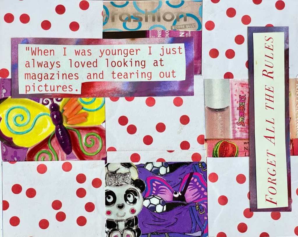 I started collage during the pandemic, listening to music, audiobooks, or podcasts while gluing down images. And these weren’t just any images. I’ve rescued magazines from the recycling bin since my age was in the one-digits, cut out pictures of lipgloss, stuffed animals, and a bewildering number of platform sandals, and collected them in an old Altoids tin. My eye for images has since evolved from pre-teen obsessions, though I still find the occasional LipSmackers or lotion image lying in there.